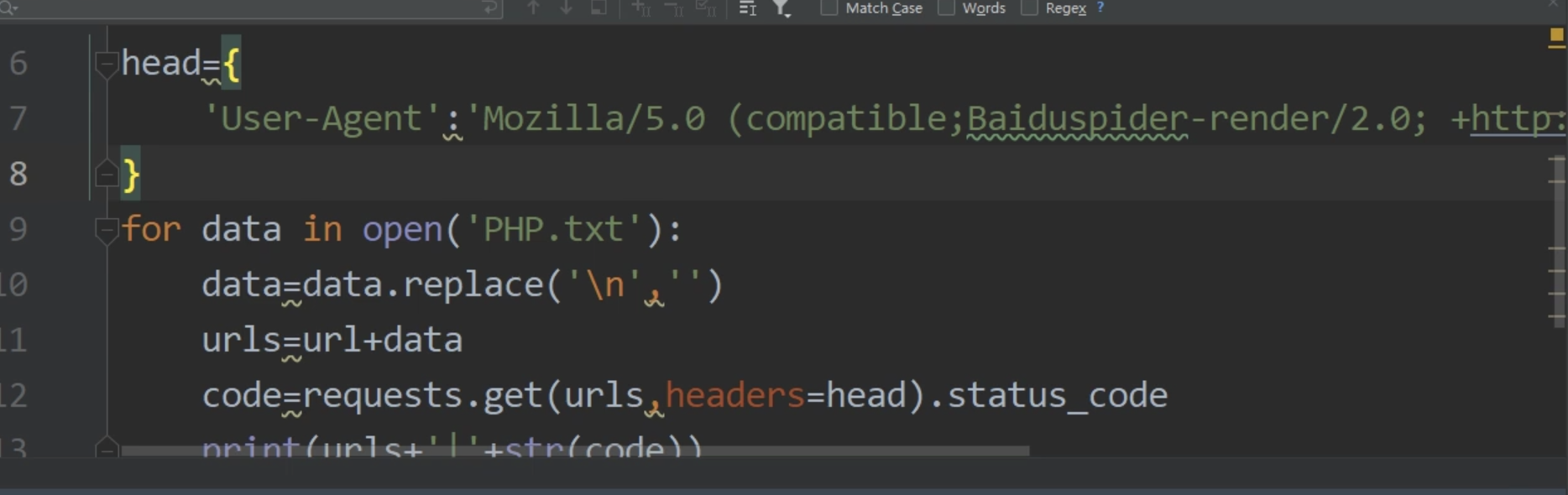 #coding: utf-8 import requests headers = { #'User-Agent':"Mozilla/5.0 (compatible;Baiduspider-render/2.0; +http://www.baidu.com/search/spider.html)" 'User-Agent':"Mozilla/5.0 (compatible; Googlebot/2.1; +http://www.google.com/bot.html)" } domain = "http://XXX.com/" with open("dicc.txt") as f: for line in f: path = line.strip() url = domain + path res = requests.get(url=url,headers=headers) status = res.status_code print("url:{} status:{}".format(url, status)) # print("response: ", res.text) # break