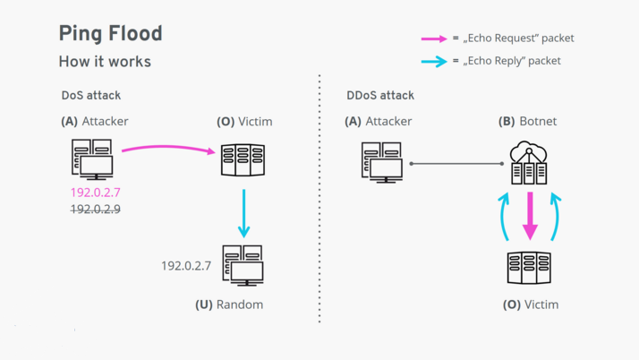 Ping Flood:此类攻击下,攻击者会使用 ICMP 应答请求数据包令服务器过载。这些请求通常由僵尸网络大规模发送。由于这些请求必须用来自目标系统的数据包来回答,数量过多就会消耗主机资源,主机资源耗尽后就会瘫痪或者无法提供其他服务。