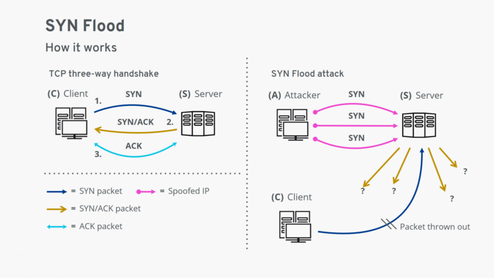 SYN Flood:这种攻击属于滥用了 TCP 三次握手连接。TCP(传输控制协议)是一种网络协议,它与 IP 一起确保互联网上的数据流量通畅。TCP 连接在三步验证中建立,该过程从客户端向服务器发送同步数据包(SYN)开始;然后服务器接收到它,服务器用自己的同步数据包(SYN)和确认(ACK)确认请求;最后连接过程以客户端确认(ACK)结束。SYN flood 会在服务器上创建大量的半开连接,比如一直停留在最后一步,服务器会将这些没有最终确认的连接存储在内存中,直到服务器资源被完全耗尽。