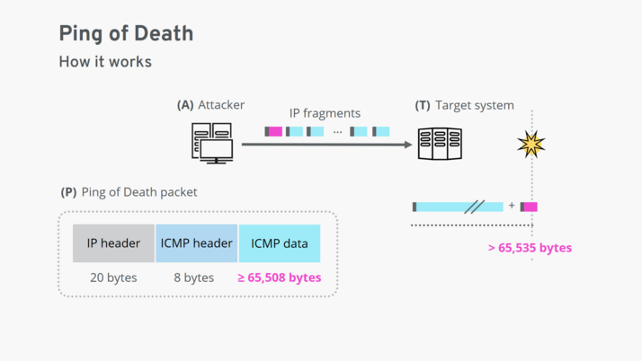 Ping of death:这种攻击的目的是造成系统崩溃。这是一种基于 IP 的攻击,这种攻击主要是由于单个包的长度超过了 IP 协议规范所规定的包长度。IP 数据包通常作为片段发送,如果组装后的 IP 数据包大于了 64 KB 的最大允许值,就会导致缓冲区溢出。包当中的额外数据就会被写入其他正常区域。这很容易导致系统进入非稳定状态,是一种典型的缓存溢出(Buffer Overflow)攻击。在一级防火墙中对于这种攻击进行检测是相当难的,因为每个分片包看起来都很正常。