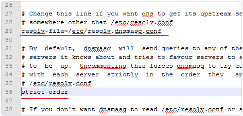 2、打开编辑,配置:resolv-file=/etc/resolv.dnsmasq.conf,表示dnsmasq 会从这个指定的文件中寻找上游dns服务器。同时取消 strict-order 前面的注册#号。