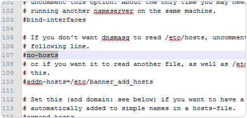 3、检查一下no-hosts前面是不是已经有了#号,默认的情况下是有的,dnsmasq 会首先寻找本地的 hosts 文件再去寻找缓存下来的域名, 最后去上游dns 服务器寻找。