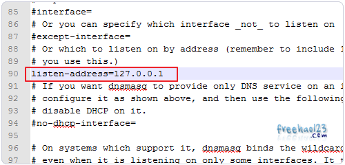 4、设置:listen-address=127.0.0.1,表示这个 dnsmasq 本机自己使用有效。注意:如果你想让本机所在的局域网的其它电脑也能够使用上Dnsmasq,应该把本机的局域网IP加上去:listen-address=192.168.1.123,127.0.0.1