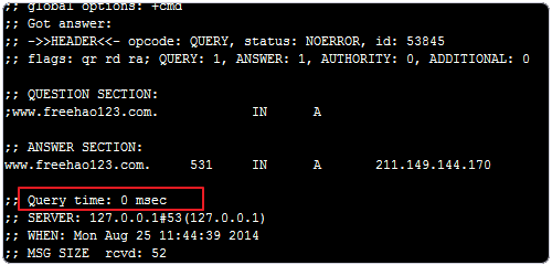 3、测试:dig www.freehao123.com,第一次是没有缓存,所以时间是200多。