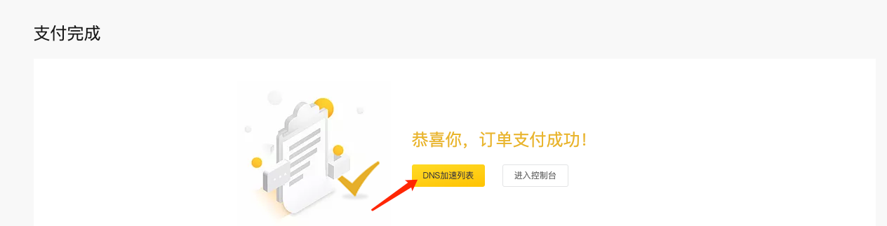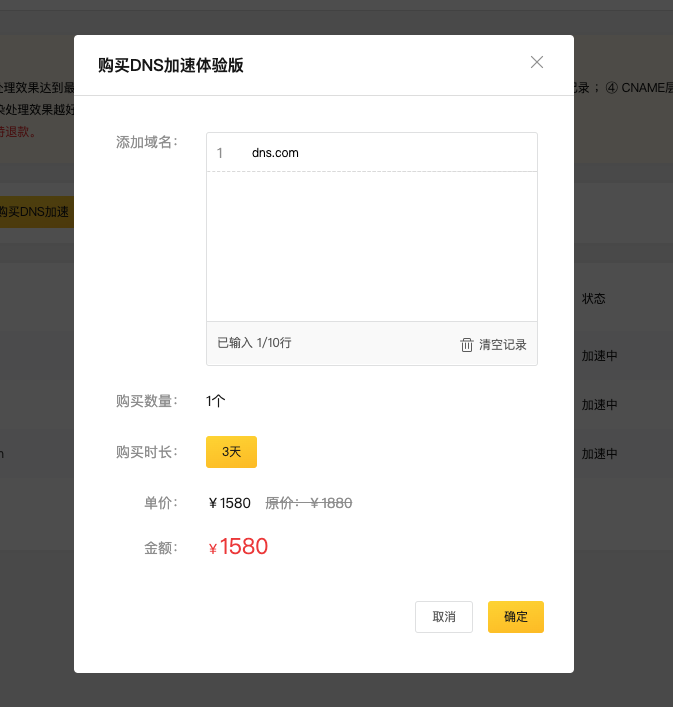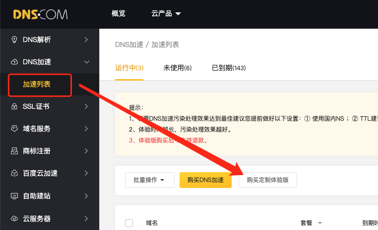 2、点击左侧导航【DNS加速–加速列表】,点击列表左上角【购买定制版体验】按钮。