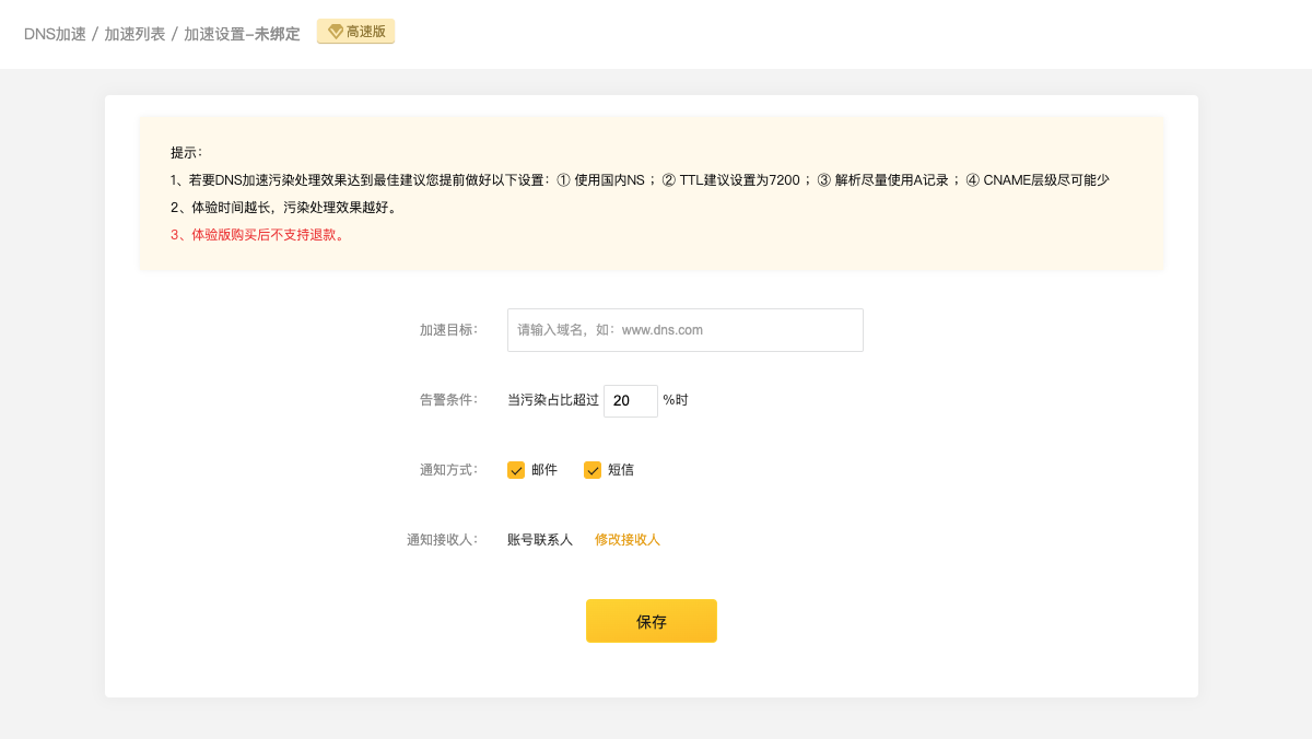 2、进入加速设置页面后,根据提示填写需要绑定的域名、设置污染告警条件、选择告警方式和告警接收人,然后点击【保存】即可。