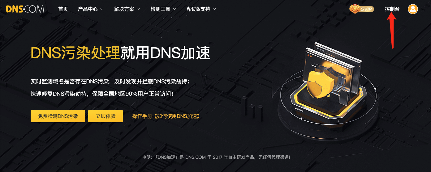 1、登录www.dns.com官网,点击顶部导航进入控制台。