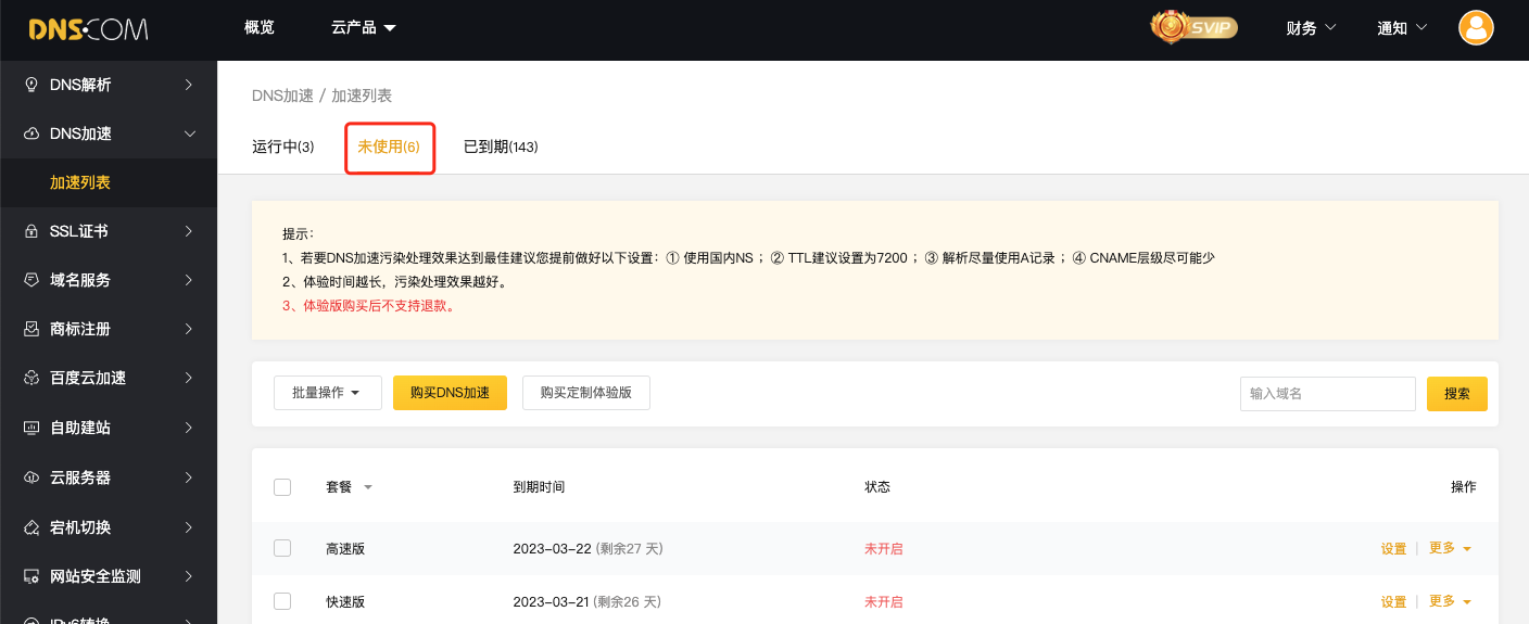 1、进入控制台DNS加速列表,点击tab切换至未使用列表,点击列表右侧【设置】按钮,进入加速设置页面。