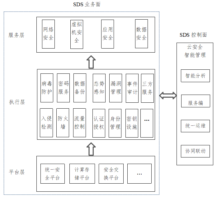 执行层由病毒防护、密码服务、数据备份、入侵检测、防火墙、流量控制等安全服务类功能组件和态势感知、漏洞管理、事件审计、认证授权、身份管理、密钥管理设施等安全管理类功能组件构成,各项安全功能组件与硬件资源完全解耦,标准化设计,支持统一编程控制接口,同时采用开放性架构设计,能够集成第三方安全服务组件,实现安全厂商之间优势互补、联防联控。服务层则是根据云环境租户需求,基于控制面的统一安全服务编排,执行层的安全功能组件联动,对网络、虚拟机的接入互联进行控制、信息流检查等,提供安全接入与隔离安全服务,对应用、数据的操作访问等提供应用访问控制和数据安全服务。