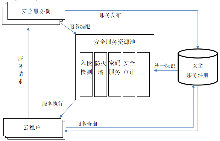 服务化的云安全体系结构,通过服务注册、服务发布、服务查询、服务请求、服务拉取、推送或绑定等环节,为服务请求者提供所需安全服务,实现安全即服务,如图3所示。各项安全服务,包括网络入侵检测、主机防火墙、密码服务、安全审计等各项基础安全服务功能,基于统一平台,形成安全服务资源池。云租户通过服务查询和服务请求,申请相关安全解决方案。