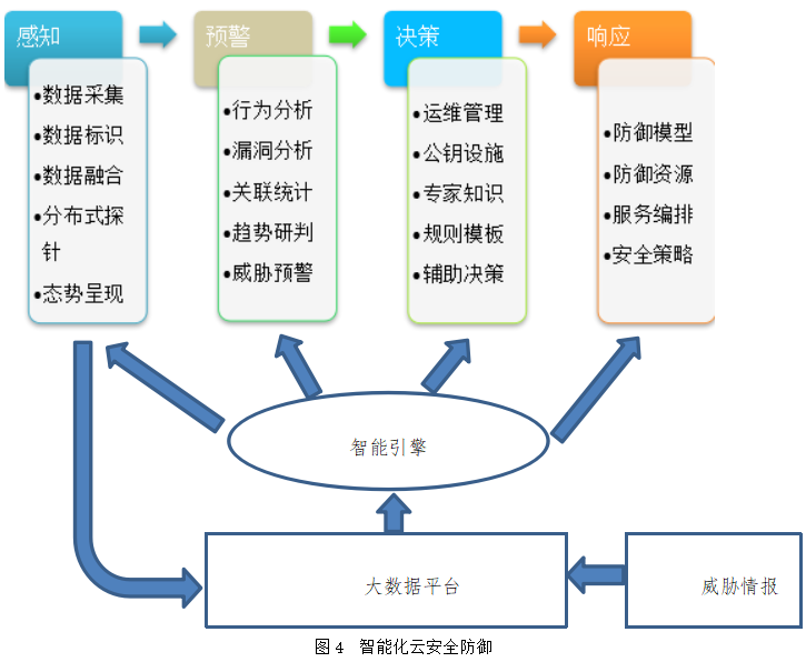 如图4所示,提升云计算体系性安全防护的智能化水平,以更加快速地应对复杂变化的云计算安全威胁。