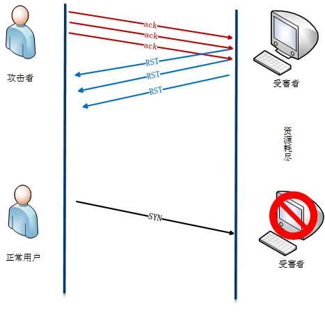 ACK Flood攻击是在TCP连接建立之后,所有的数据传输TCP报文都是带有ACK标志位的,服务器在接收到一个带有ACK标志位的数据包的时候,需要检查该数据包所表示的四元组是否存在,如果在检查中发现该数据包不合法就会回应RST包告诉对方此端口不存在。服务器要做两个动作:查表、回应ACK/RST。攻击者发送大量的ACK包,服务器忙于处理这些非法数据包导致资源耗尽,无法响应正常的请求。