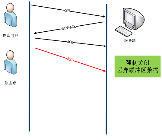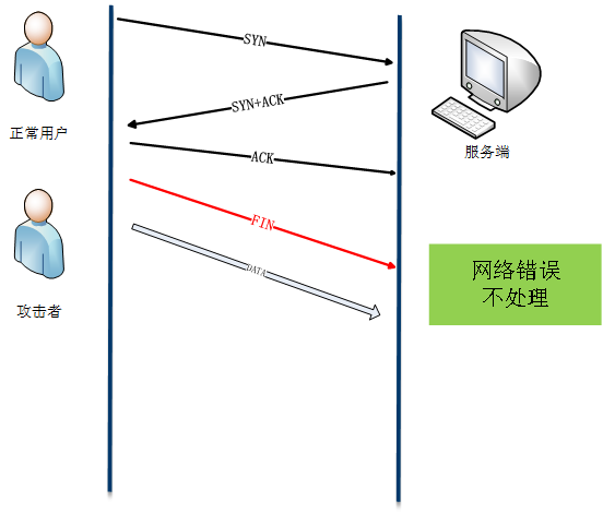 正常用户和服务器连接时,攻击者发送一个伪造的FIN包给服务端,这个伪造的FIN包源地址是正常用户的地址,服务端收到后就会断开与正常用户的连接,随后正常用户发送的数据服务器会认为是网络错误而忽略掉