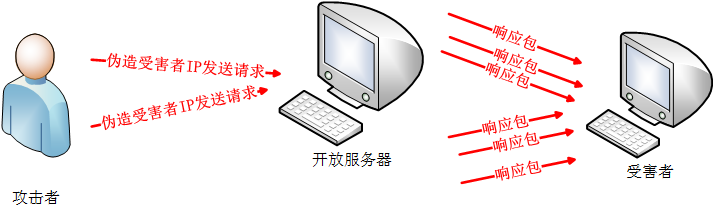 反射放大攻击原理利用一些协议的请求数据包和响应数据包比例不平衡的特点,就是响应包大于请求包,攻击者通过伪造受害者的 IP 地址、向开放性的服务器发送构造的请求报文,开放服务器会将大量的响应数据包发送受害者 IP,,间接形成 DDoS 攻击,如dns reflect flood /snmp reflect flood/ ntp reflect flood