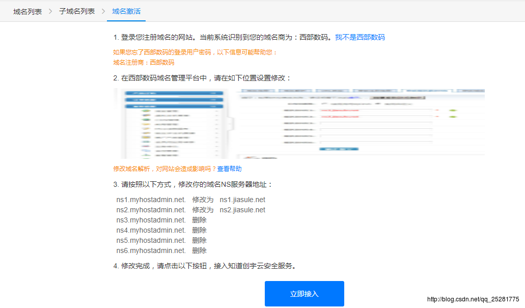 NS方式接入:需要到域名服务提供商后台控制面板修改DNS解析记录,一般全球生效时间为2~24小时以内(若不清楚请咨询你的域名服务提供商或在线咨询云安全客服); CNAME方式接入:(推荐)接入速度快,只需要短暂的几分钟时间即可生效;