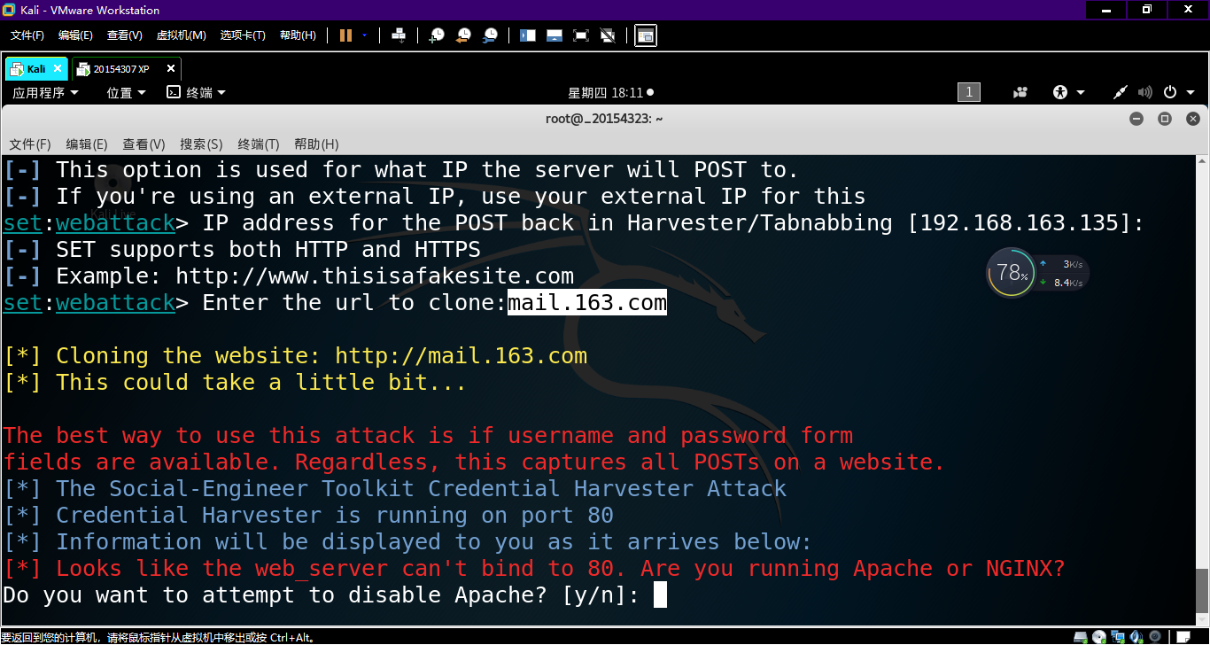 接着要让冒名网站在别的主机上也能看到,需要开启本机的Apache服务,并且要将Apache服务的默认端口改为http协议端口号80,使用指令 netstat -tupln | grep 80 指令查看80端口是否被占用,如果有其他服务在运行的话,用kill+进程ID杀死该进程。