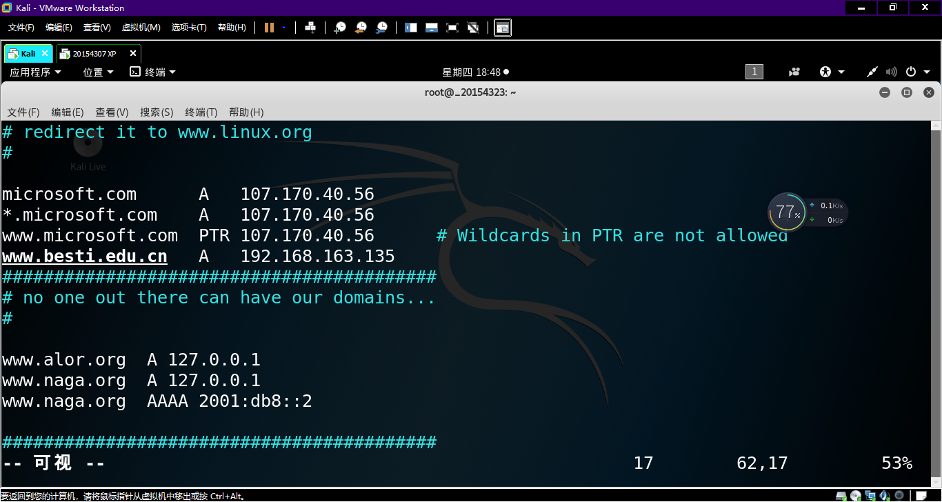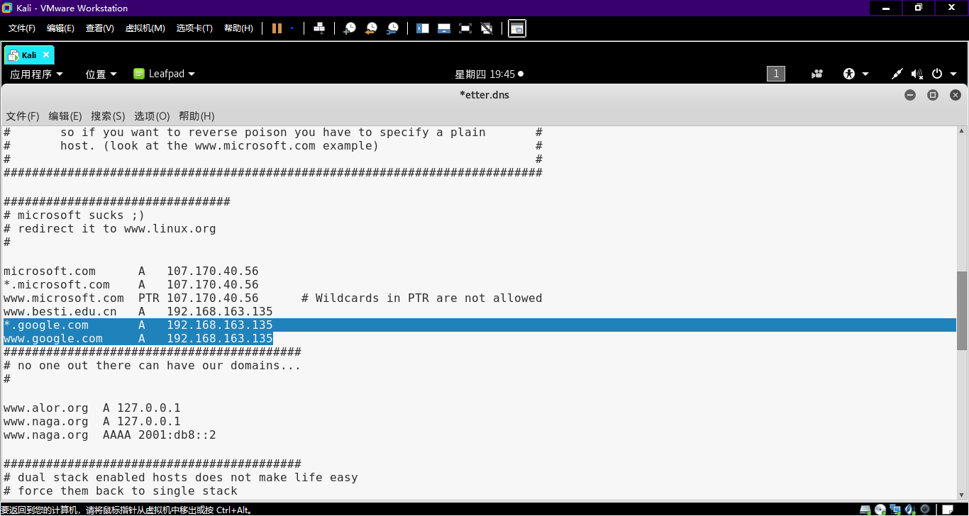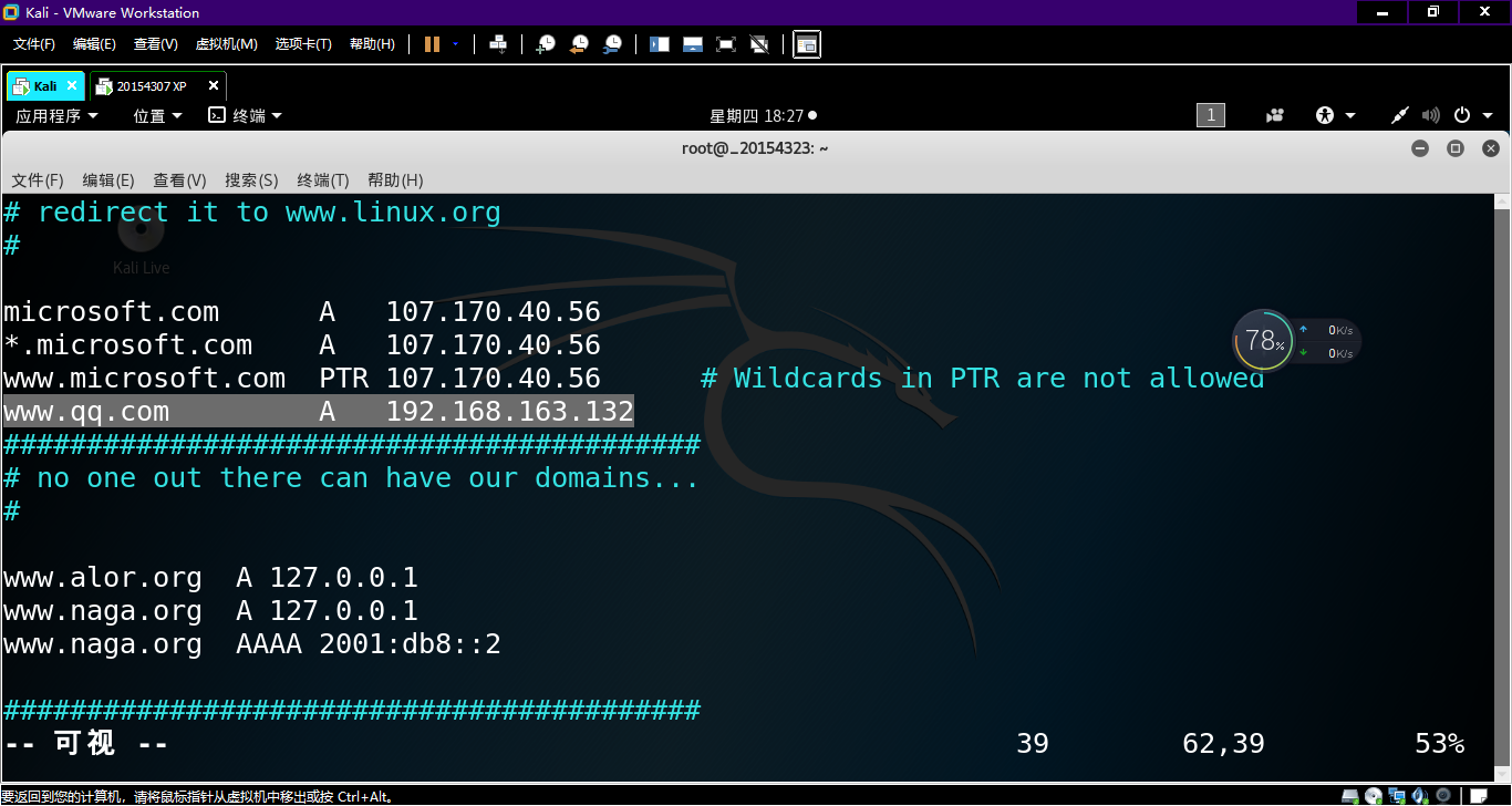 输入指令 vi /etc/ettercap/etter.dns 对DNS缓存表进行修改,在图中位置添加纪录,我添加了一条对QQ主页的DNS记录,后面的IP地址设为攻击机kali的IP。
