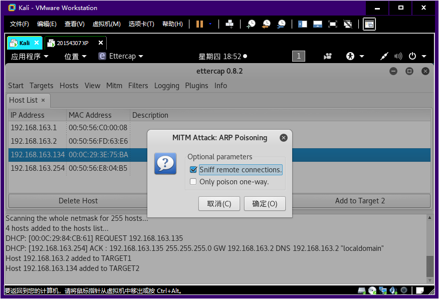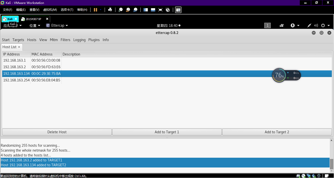 选择菜单栏中的Hosts,先点击 Scan for hosts 扫描子网,接着点击 Hosts list 查看存活主机,将攻击机Kali的网关IP添加到target1,靶机IP添加到target2 下面蓝色高亮部分我有标出来。