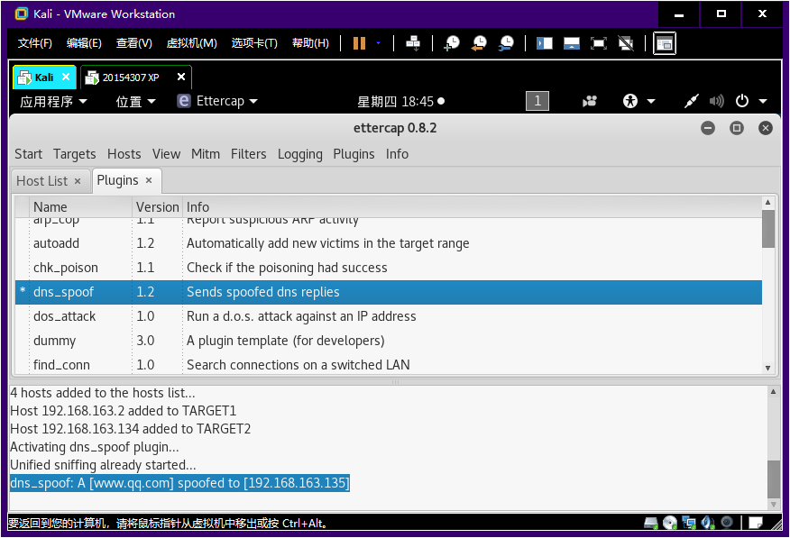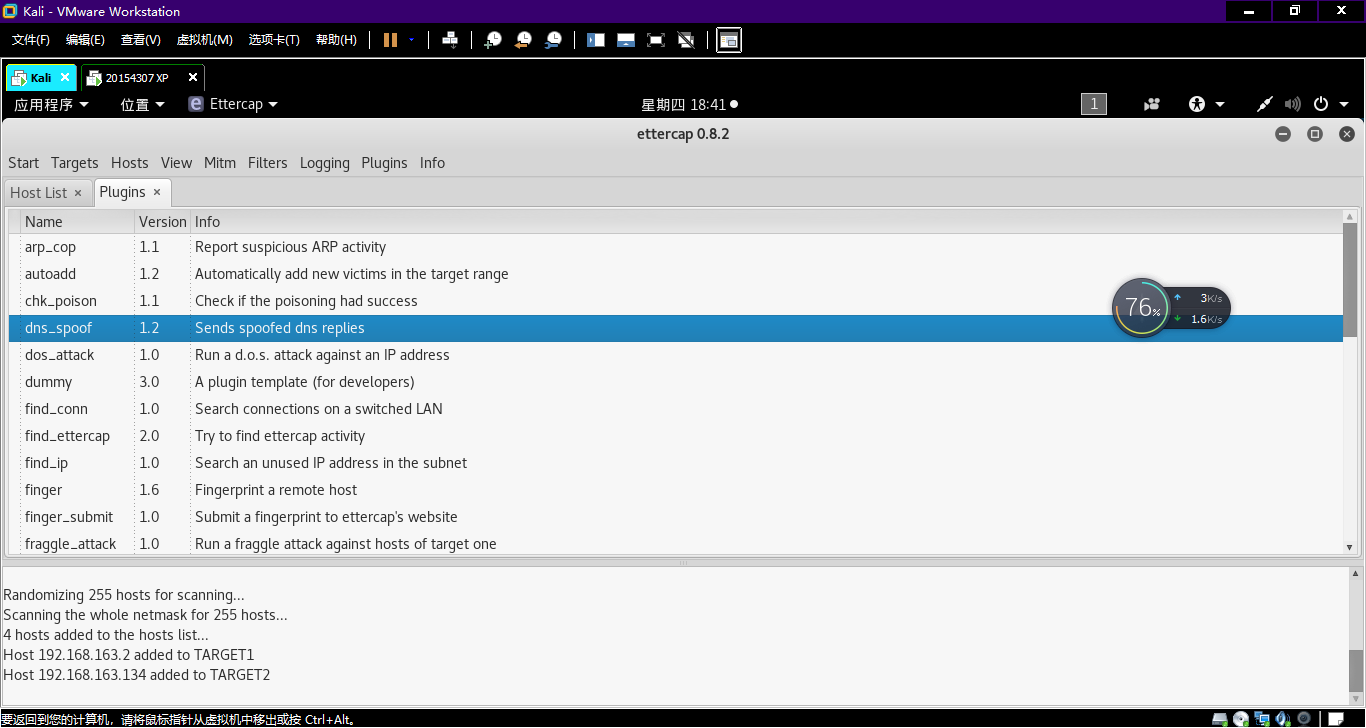 选择Plugins——Manage the plugins,双击选中DNS欺骗攻击的插件dns_spoof。