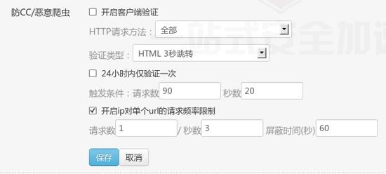 进入用户控制面板——安全——安全配置——防CC攻击配置。勾选防CC,勾选放行搜索引擎,我这里的配置是请求数90,秒数20,点击保存后立即生效,如下图: