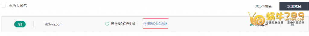 3、添加完成后点击导航栏的“域名列表”,回到域名列表,点击“待修改DNS地址”查看360网站卫士的DNS服务器地址
