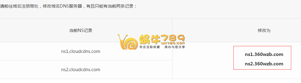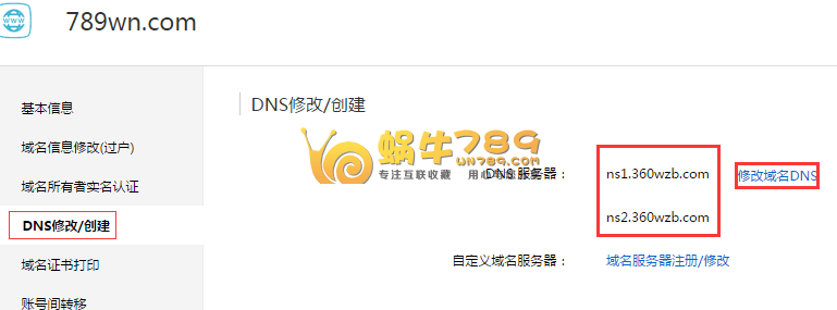 4、最后到你的域名控制面板修改DNS服务器地址,改为360网站卫士的DNS服务器地址。