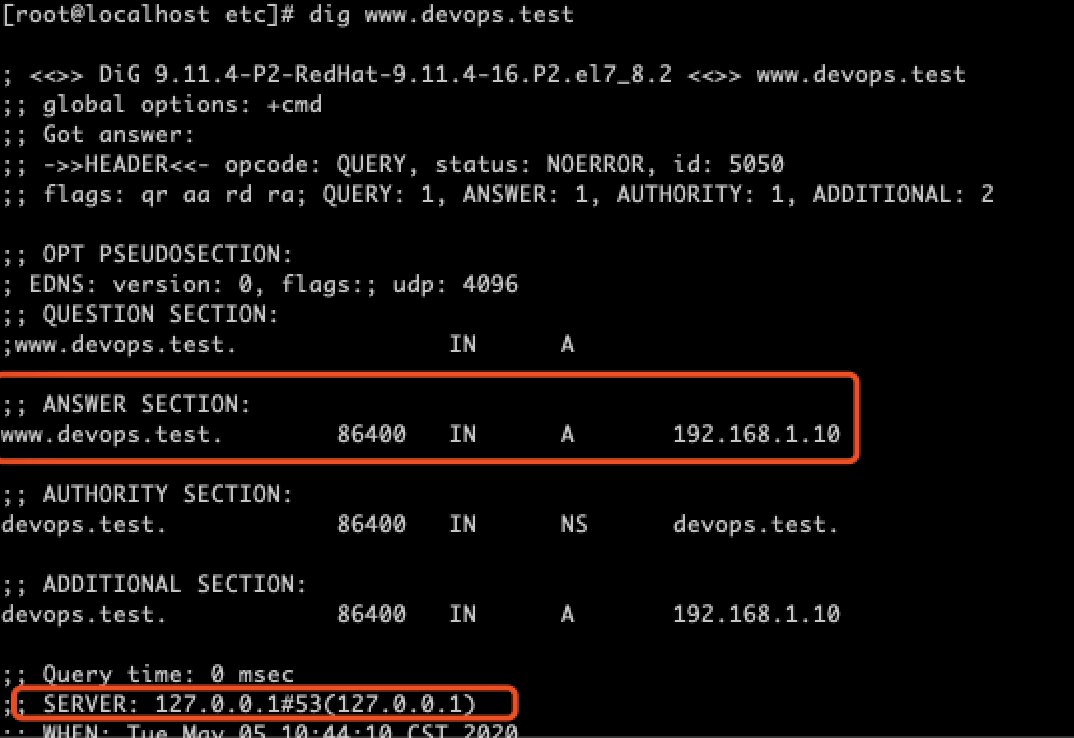 6.1、在本机上测试,修改DNS服务的ip地址即可(命令:vim /etc/resolv.conf ),然后使用命令dig(命令:dig www.devops.test)测试