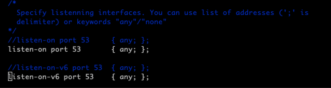 # vim /var/named/chroot/etc/named.conf /* Sample named.conf BIND DNS server 'named' configuration file for the Red Hat BIND distribution. See the BIND Administrator's Reference Manual (ARM) for details about the configuration located in /usr/share/doc/bind-{version}/Bv9ARM.html */ options { // Put files that named is allowed to write in the data/ directory: directory "/var/named"; // "Working" directory /* Specify listenning interfaces. You can use list of addresses (';' is delimiter) or keywords "any"/"none" */ //listen-on port 53 { any; }; listen-on port 53 { 127.0.0.1; }; //listen-on-v6 port 53 { any; }; listen-on-v6 port 53 { ::1; }; }; zone "devops.test" { type master; file "devops.test.zone"; };