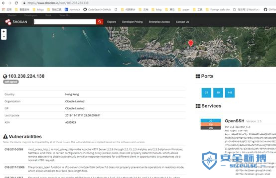 探测端口可以使用浏览器shodan插件,数据更新特别迅速,从截图可以看到。shodan是分布式主机分工各扫单一端口,入库汇总。对于我们的测试对象,每台主机仅扫描一个端口所以可以防止被ban。端口探测变成了api访问,例如探测一个c段网络服务,速度会更快,更快发现其余资产,缺点就是只扫描常用端口。