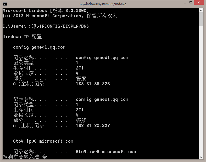 2、在弹出的命令提示符窗口输入“ipconfig/displaydns”我们可以看到系统中有多条我们之前使用过的DNS地址: