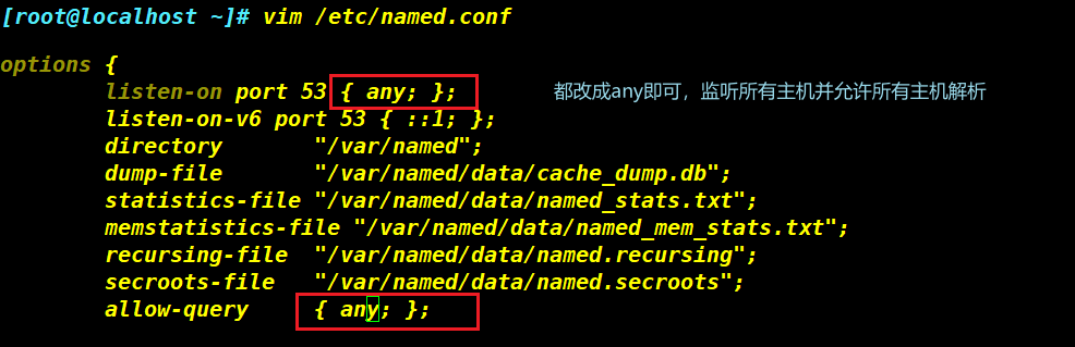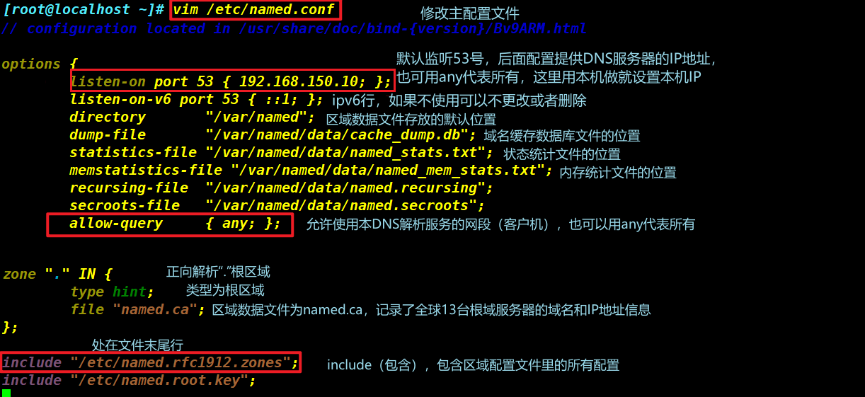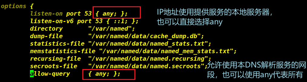 二》修改全局配置与DNS正向解析一样,配置文件,每条配置记录的行尾以分号“;”表示结束,以“#”号或“//”开始的部分表示注释文字(大段注释可以使用“/*……*/”的格式)