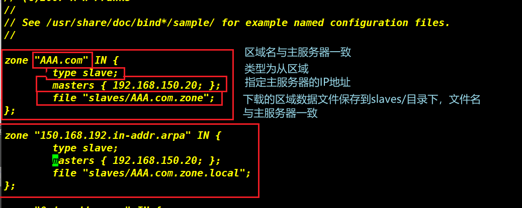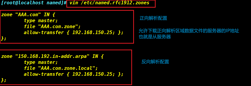 allow-transfer { 192.168.150.25; } 允许从服务器下载正向区域数据,这里添加从服务器IP地址