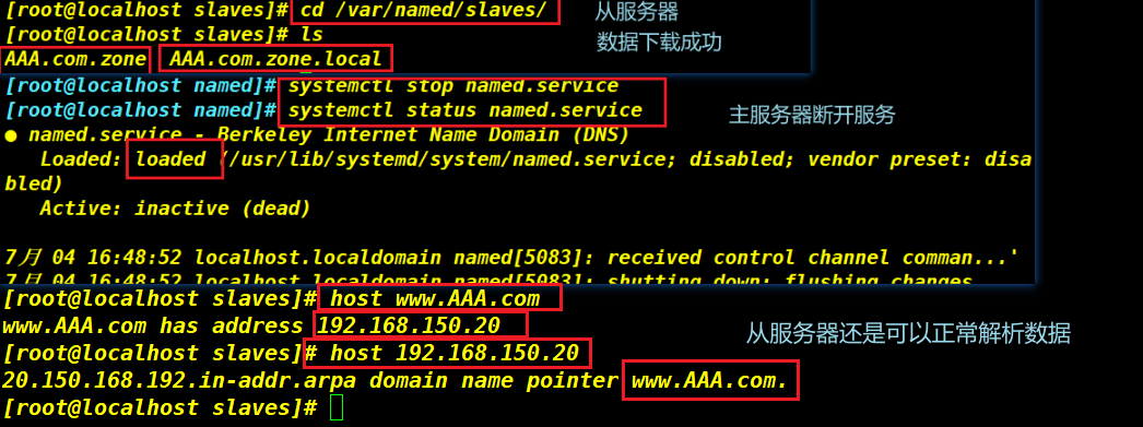 六》重启主服务器和从服务器的服务,查看区域数据是否下载成功,断开主服务器,查看从服务器能否正常解析数据