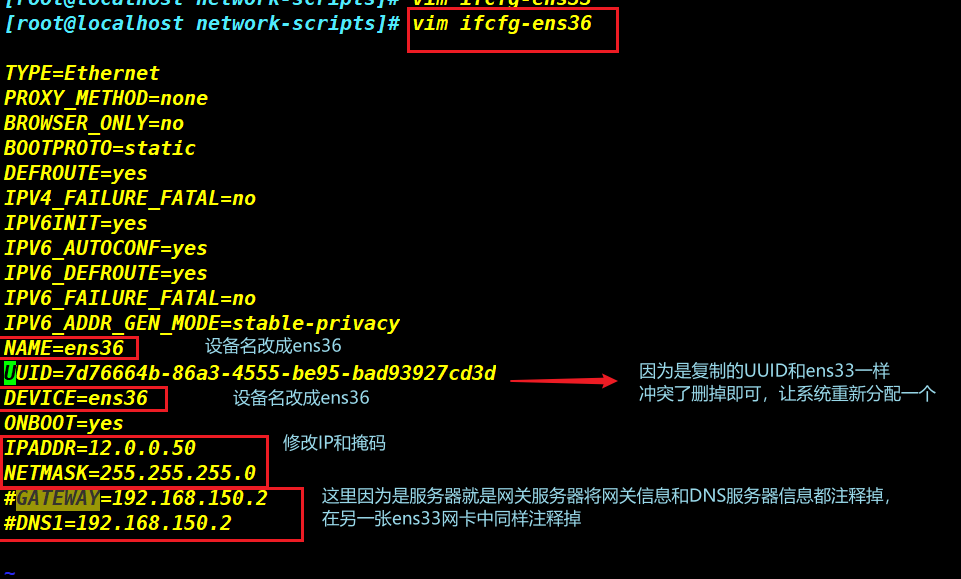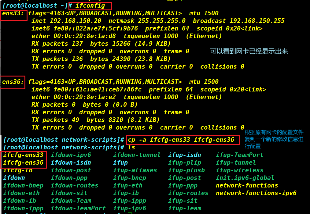 进入网卡配置相关信息,结束后重启两张网卡,然后ifconfig检查一下是否成功生效