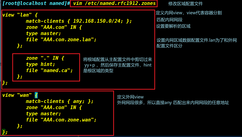 三》修改区域配置文件,区域配置参数使用“zone ……{};”的配置格式,一台DNS服务器可以为多个区域提供解析,因此在named.conf文件中可以有很多个zone配置段