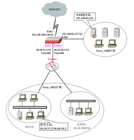 内网 area_eth2 区域的文档组(10.10.10.0/24)可以上网;允许项目组领导 (10.10.11.2 和 10.10.11.3)上网,禁止项目组普通员工上网。