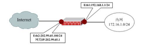 背景:网络卫士防火墙作为网关接入网络,设备的 eth2 口(接口 IP:202.99.65.100/24, 网关 IP:202.99.65.1)与外网相连,设备的 eth1 口(接口 IP:192.168.1.1/24)与内网 (192.168.1.0/24)相连,内网用户通过 Eth1 口访问外网,如图所示。