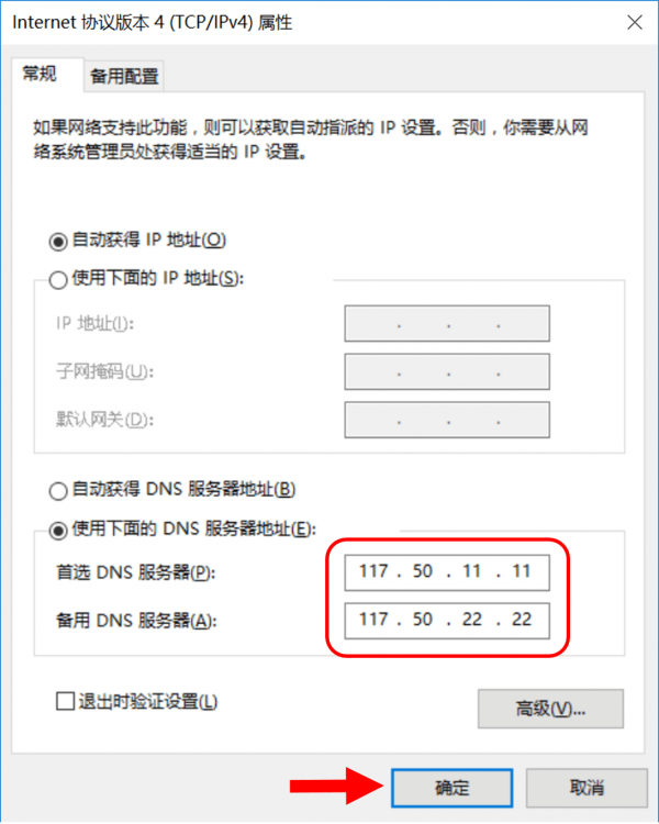 最后,需点击“使用下面的DNS服务器地址”,然后在首选DNS服务器当中填入“117.50.11.11”,在备用DNS服务器中填入“117.50.22.22”。而后点击确认并关闭所有窗口。