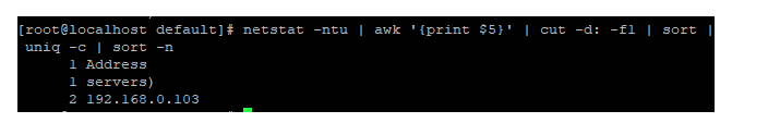 - netstat –ntu | awk ‘{print $5}’ | cut –d: –f1 | sort | uniq –c | sort –n