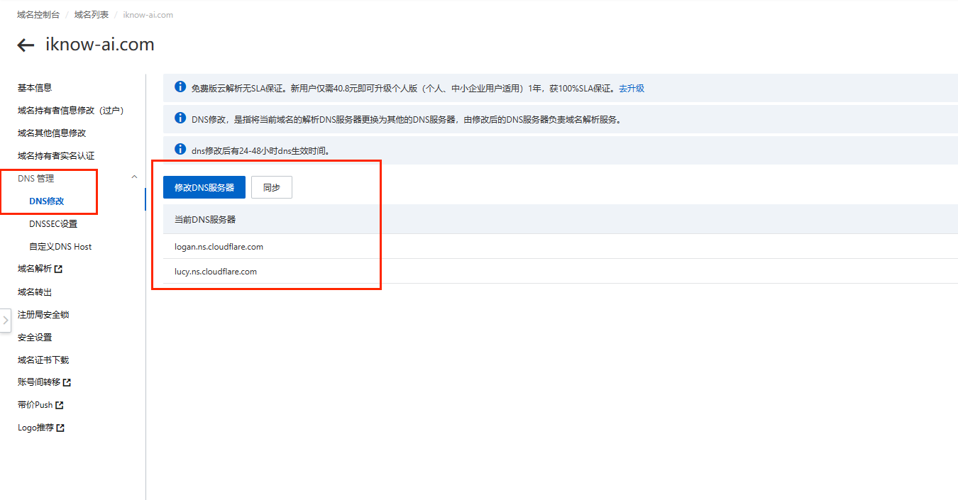 比如我的域名是在阿里云上,我们就可以在下面这里,修改为cloudflare 要求的DNS地址