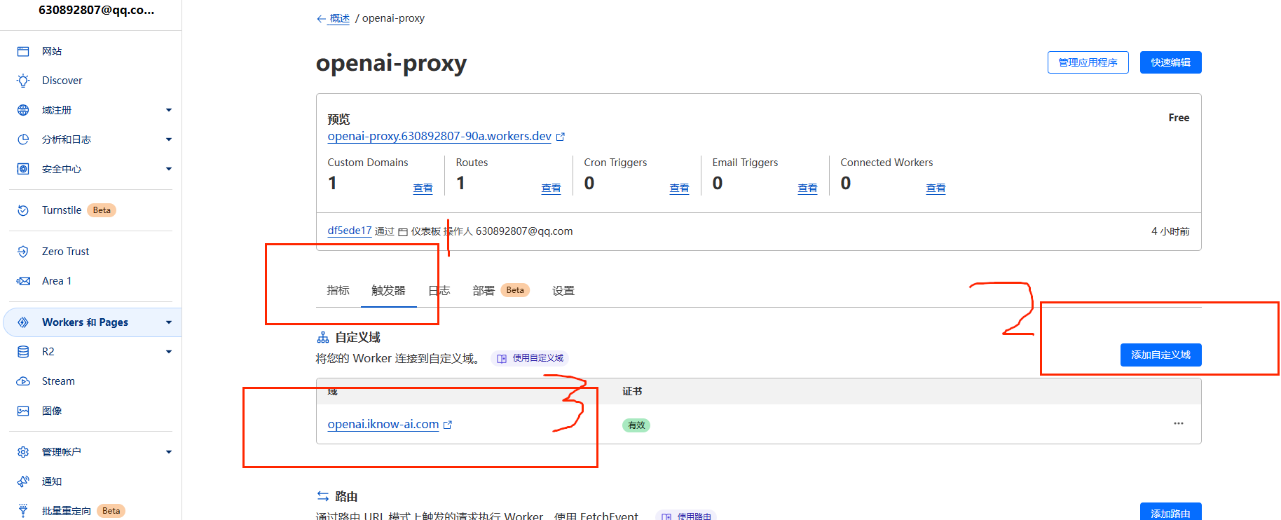 就回到Worker配置那里,增加一个域名转发,我添加了一个自己的自定义域名