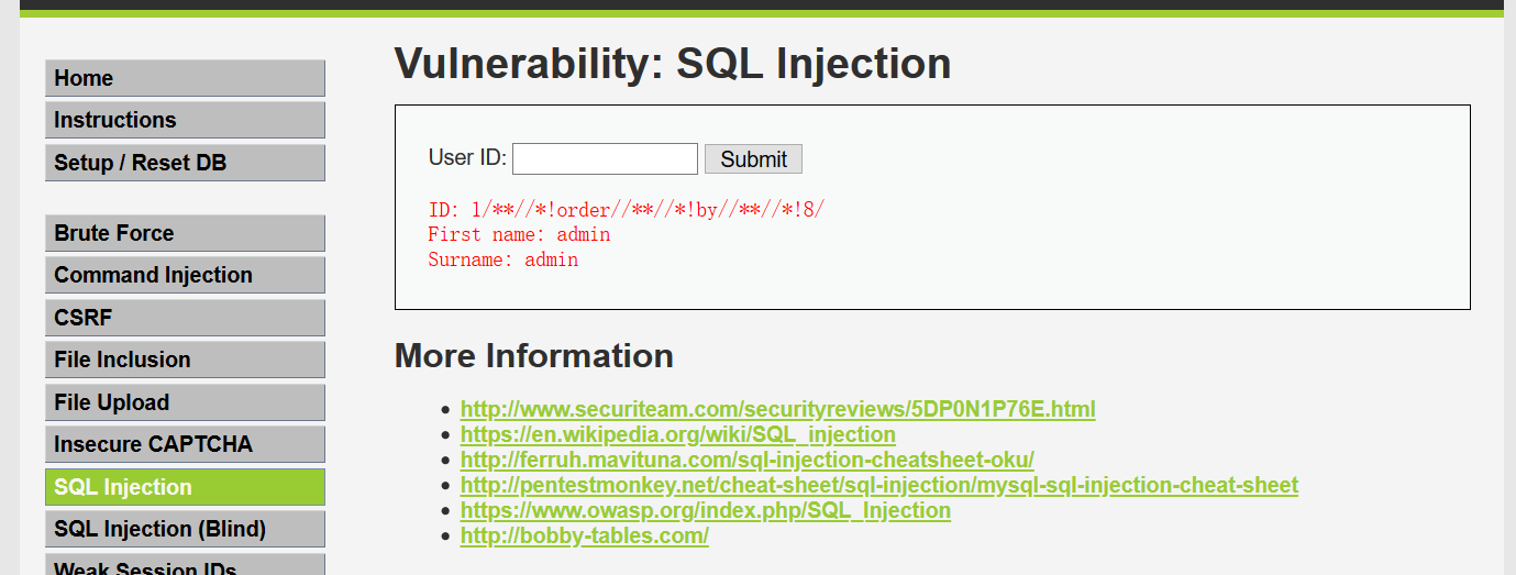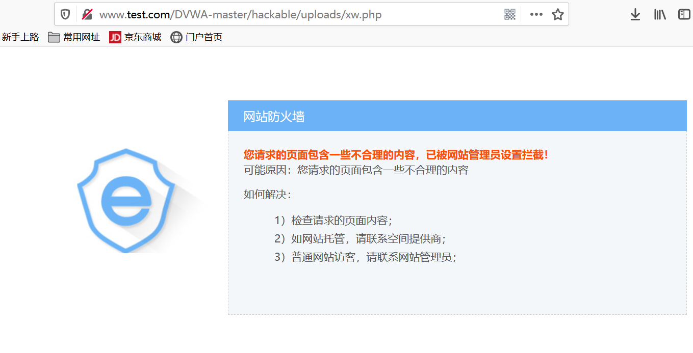 这里以dvwa为例,选择注入模块,简单输入测试的,发现被拦截了