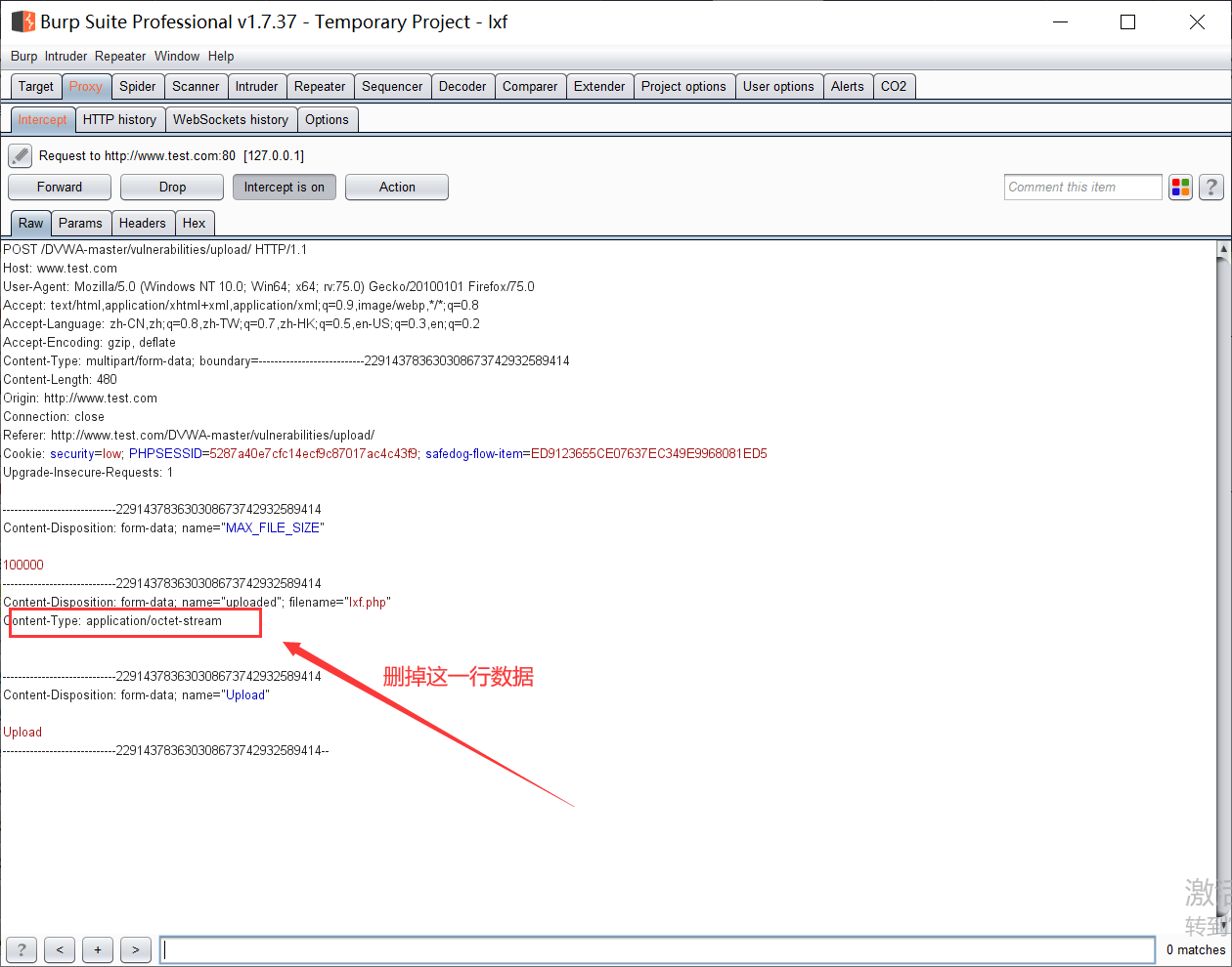 接下来使用burpsuite,将下面的Content-Type 删除,直接上传.php后缀。