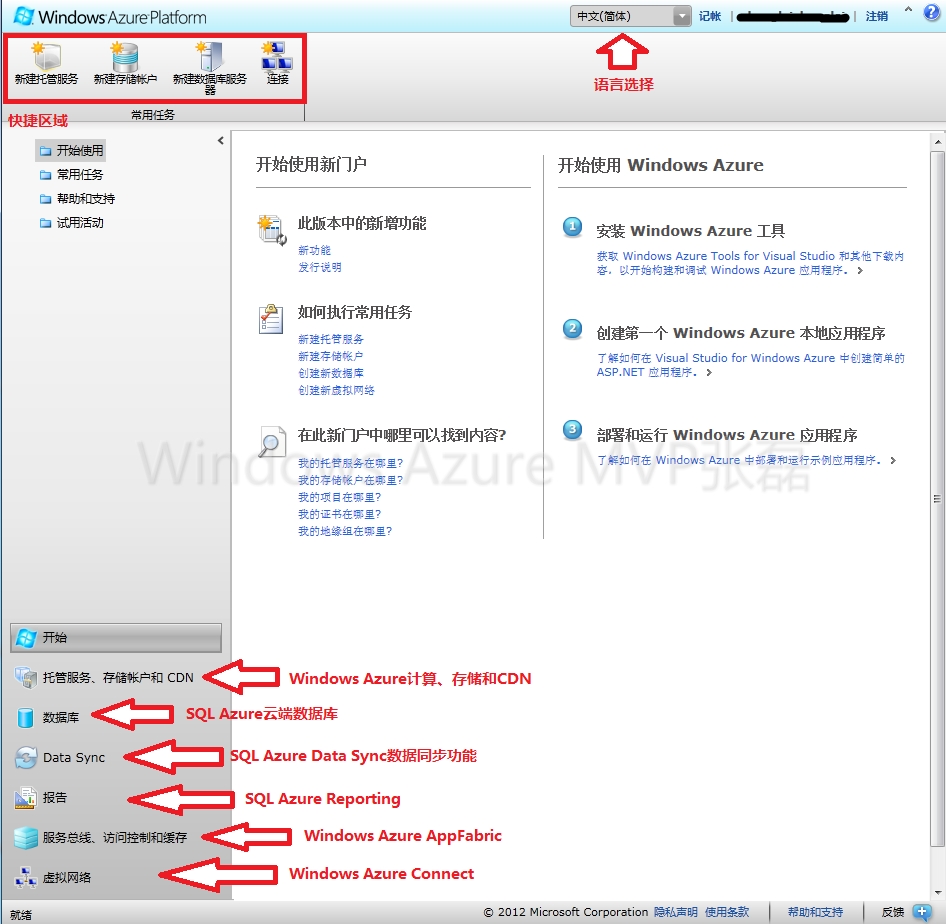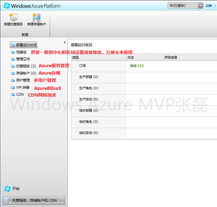 Windows Azure提供了管理网站:https://windows.azure.com 让管理员和开发人员登录并且管理Windows Azure的资源。最新的管理网站版本是基于Silverlight开发的。