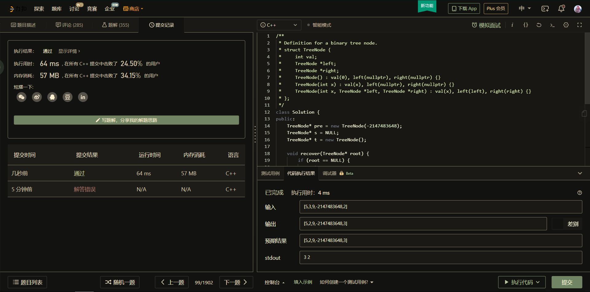 发现二叉树还有个例题没做,看了书上思路写出来的,二叉搜索树中序遍历就是从小到大遍历所有节点,学到了。不过还是被不讲武德的力扣坑了一发