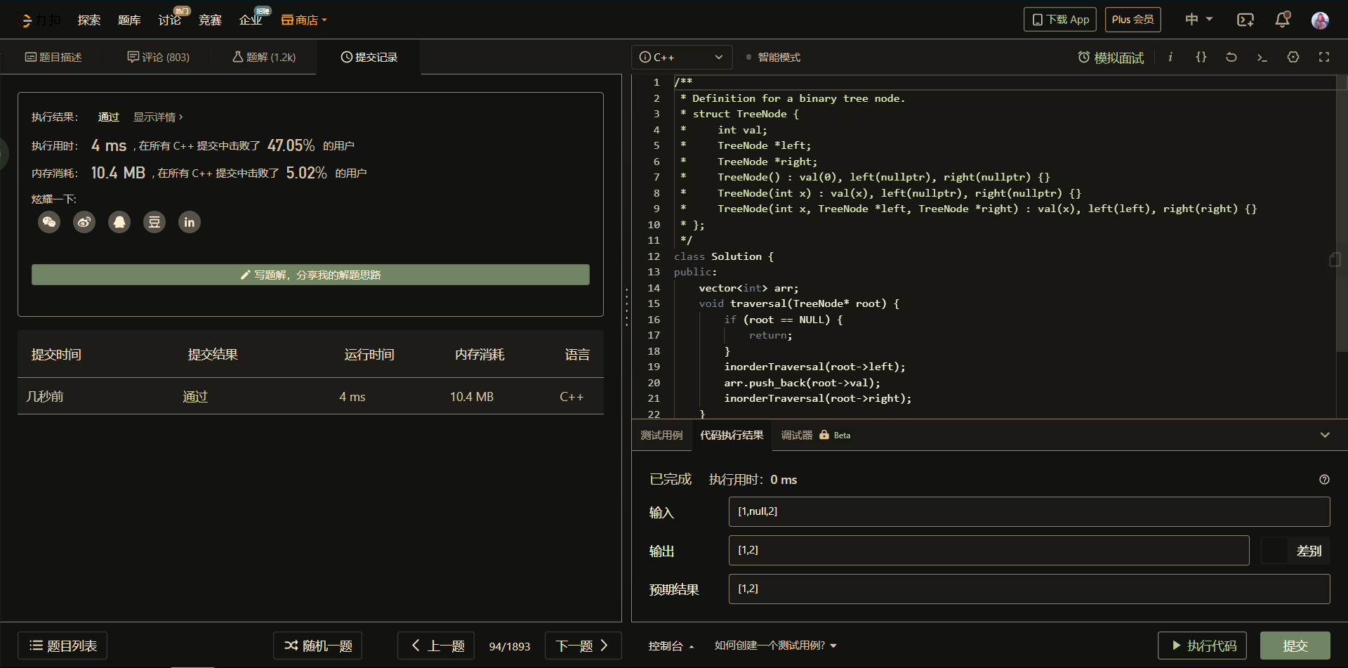 然后水一道二叉树中序遍历,这应该是我有史以来做leetcode最快的一次
