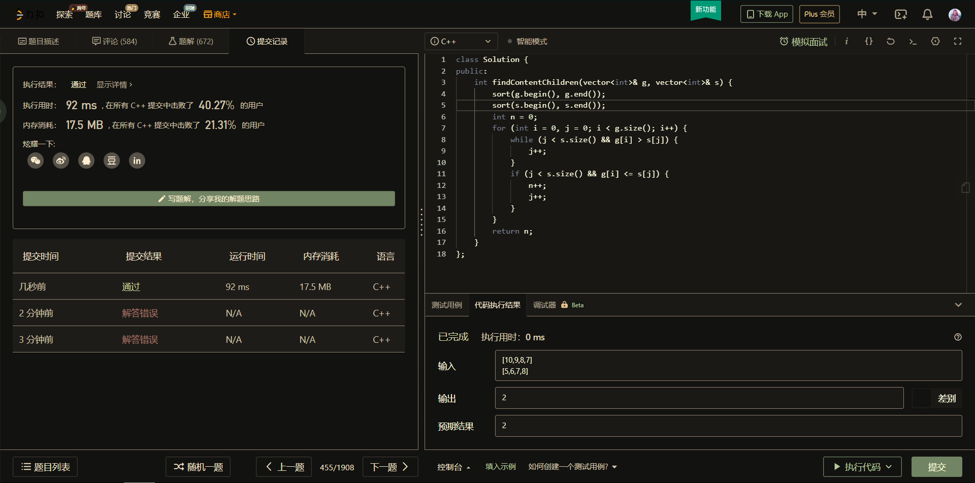 题不难,没注意题目要求饼干有数量限制WA一发,想到了给的数组不一定是有序的,但是忘了排序了WA一发,正确率又被我愚蠢的拉低了
