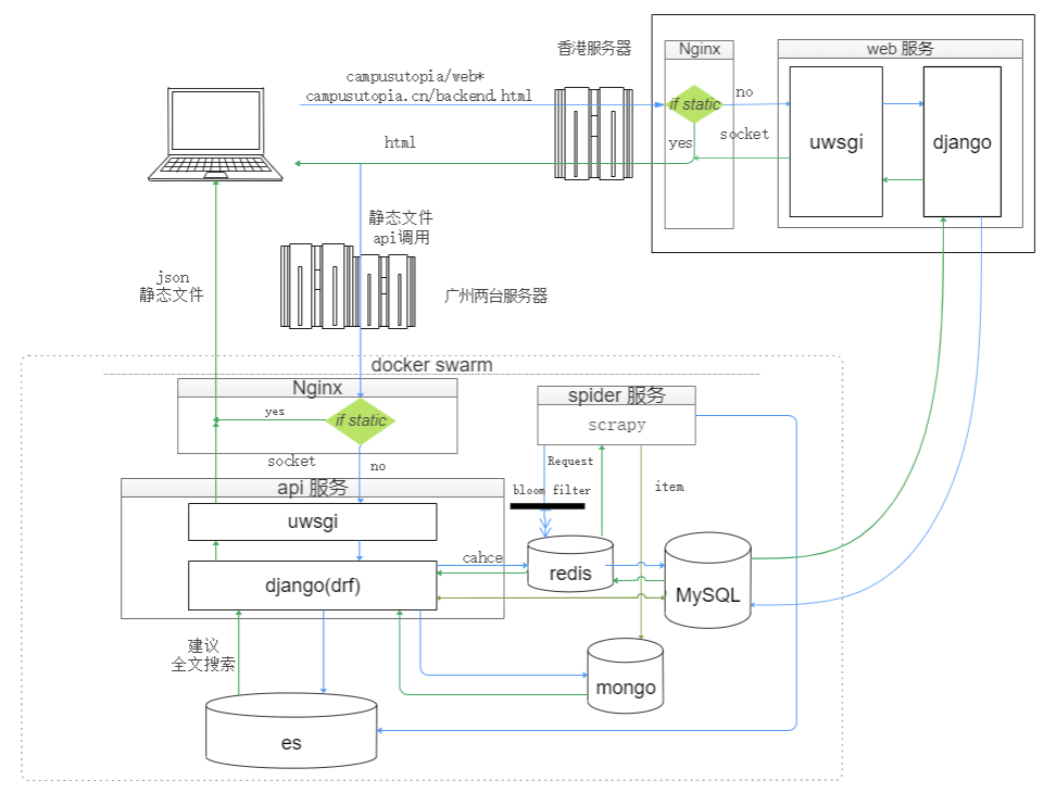 - 后台页面应用Vue作前后端分离,html文件由香港服务器返回,其余静态文件由广州返回。后端由django(drf)处理返回json数据。
